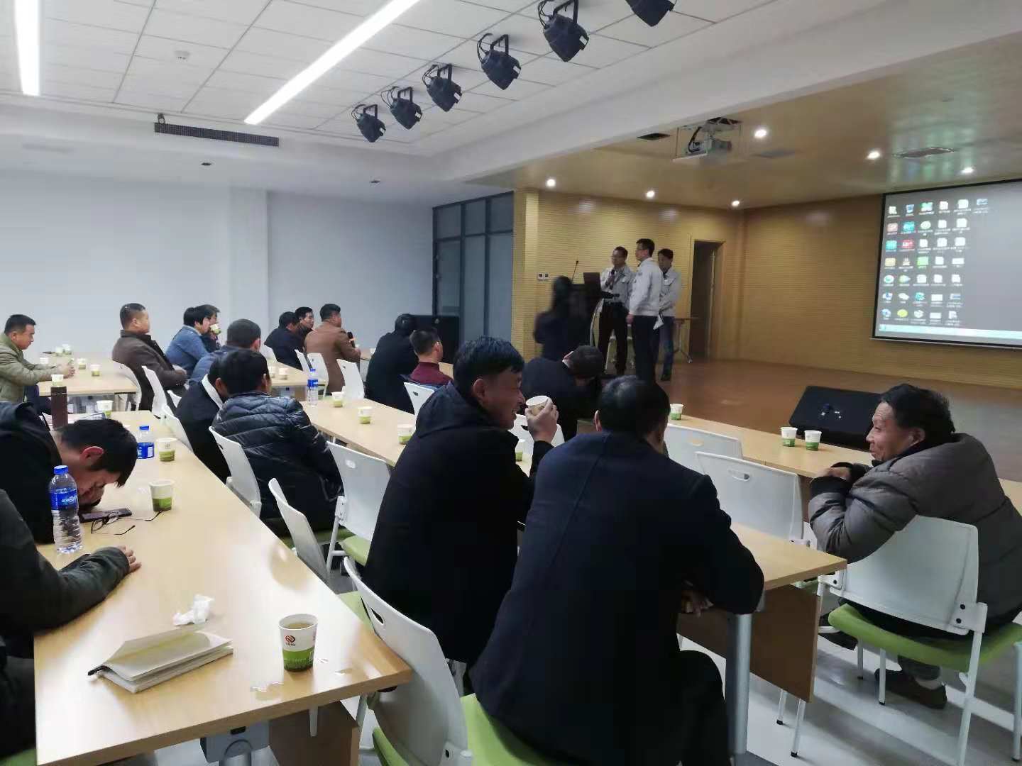 隨后一行人來到二樓多功能廳,銷售王經理詳細給大家介紹了亞澳農機的幾大系列產品:旋耕機、小麥花生精量播種施肥機、深松機及聯合耕整機。把這些機具的配套馬力、功能作用及產品特點都作了詳細的介紹。