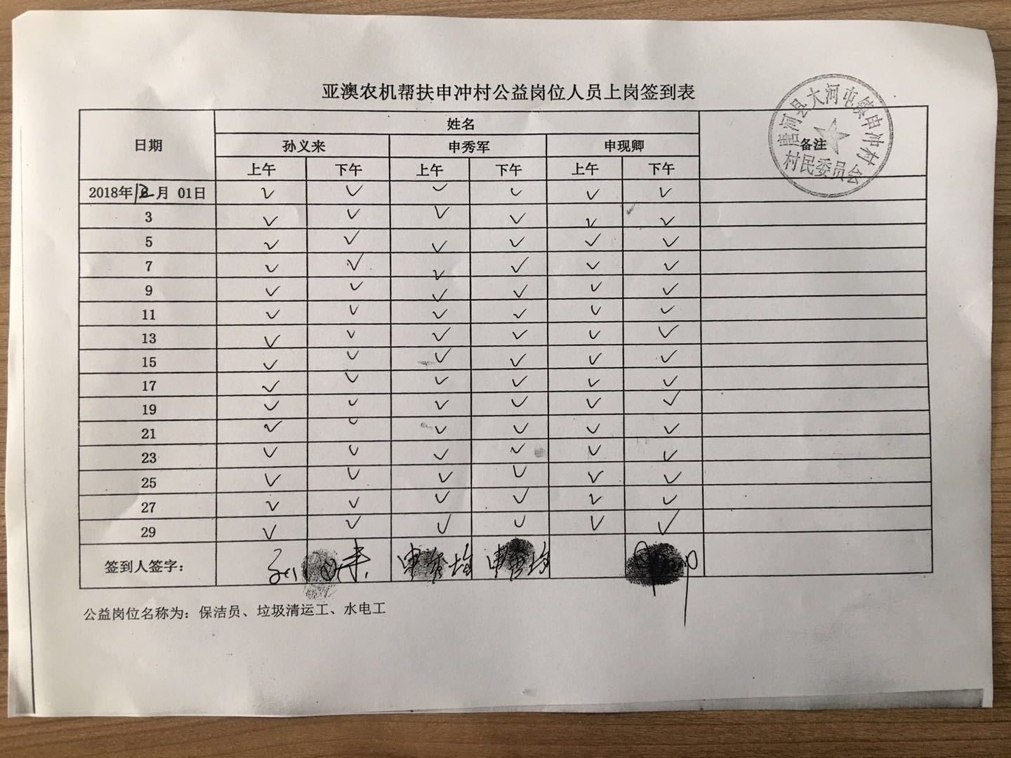 除此之外,我公司聯合村委會照顧一些特別貧困但有行動能力的老人為村部垃圾清運、水電維修、村落清潔等,并為此購買公益崗位,每月定期給這些公益崗位發放工資,以確保他們的正常生活。