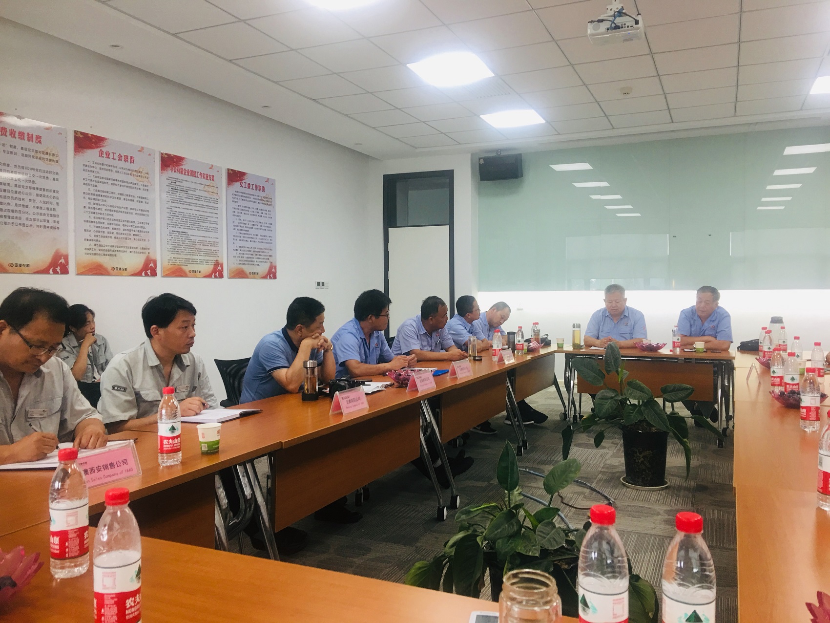 隨后,一行人來到了會議室舉行了座談會,亞澳西安公司王總表示,本次來到南陽公司的目的是為了學習了解南陽工廠生產的產品,反饋目前銷售中存在的問題,同時通過對南陽工廠的理解激發一下員工對未來市場的銷售信心。